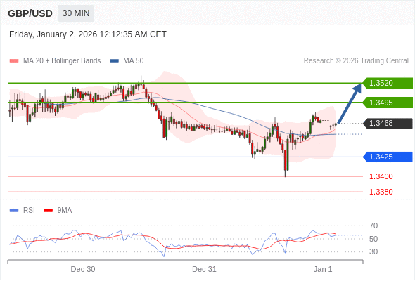 在 1.3425 之上,看涨,目标价位为 1.3495 ,然后为 1.3520 。
